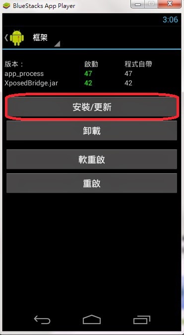 2.打開Xposed,選擇「框架」→「安裝/更新」