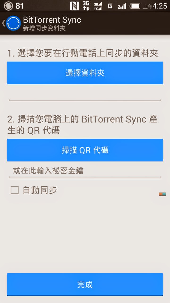 BitTorrent Sync是不需要任何權限的,所以無法跟手機的跟目錄只能選擇內部記憶卡,手機端